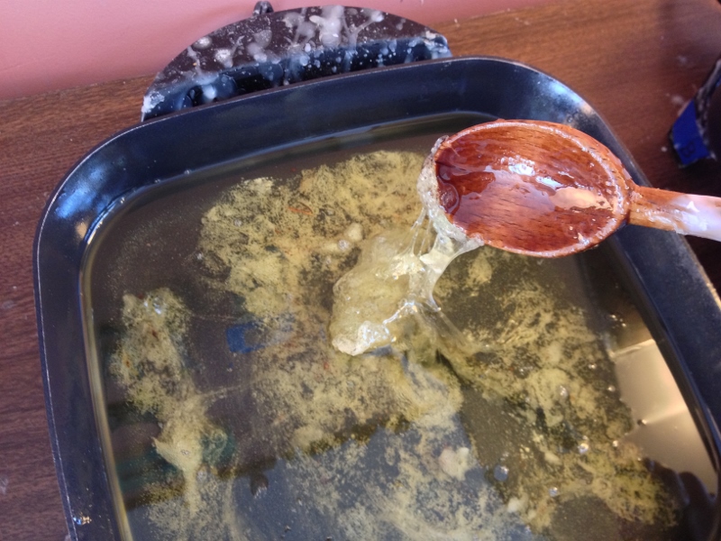 3 (800×600) Published February 27, 2014 at 800 × 600 in Making Your Own Encaustic Medium ← Previous Next → Come back in an hour or so and check out the happenings. Looks like STIFF Taffy. It’s stuck to the bottom. Raise the temperature to 170* and leave it for a couple hours.